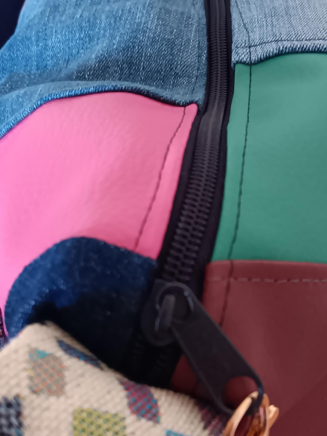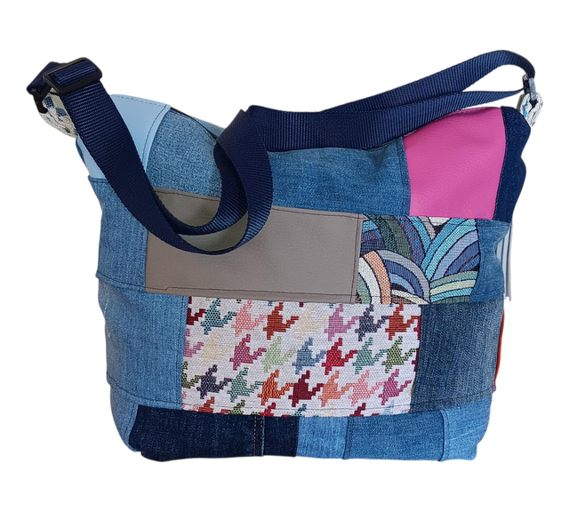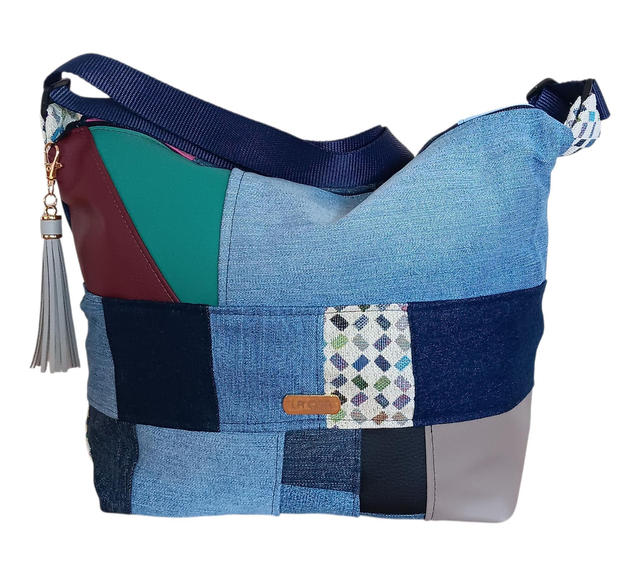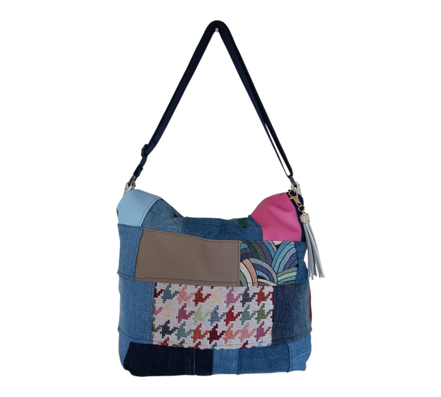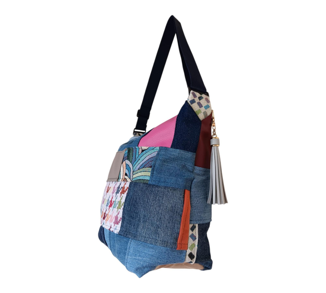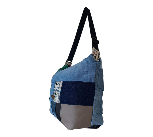 Este bolso nace de la unión de distintos trozos de telas recicladas, recuperadas y transformadas en una pieza única e irrepetible. No hay dos iguales: cada combinación de colores y texturas cuenta una historia distinta.