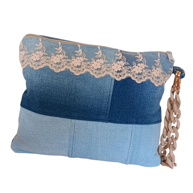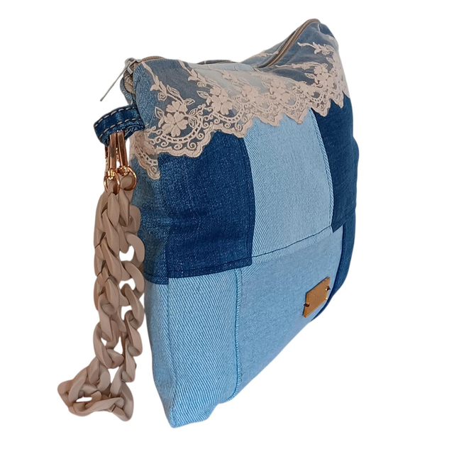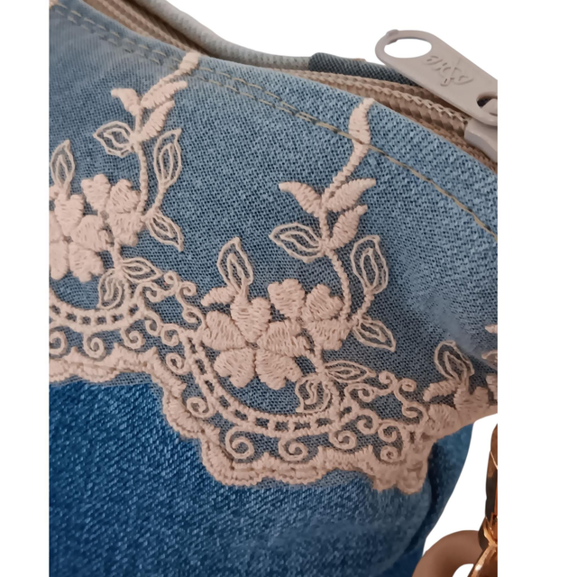 Confeccionado con retales de vaqueros que guardan historias en su tejido, este bolso de mano irradia dulzura y elegancia natural 🌿.