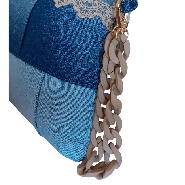 Un delicado encaje con transparencias en tono beige lo envuelve con un aire romántico y atemporal, mientras su asa de cadena gruesa en el mismo color completa el conjunto con armonía y sutileza ✨.