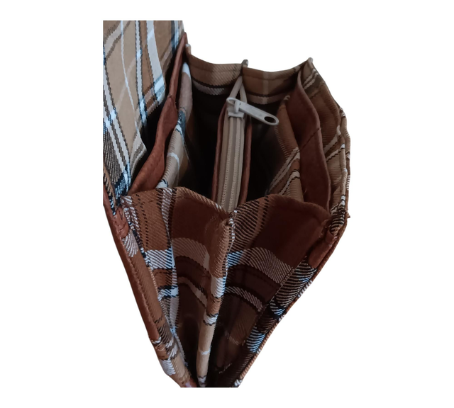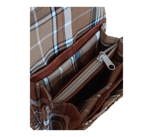 Esta cartera de tela con cuadros escoceses en tonos marrones combina elegancia tradicional con un diseño funcional y sostenible. Su acabado en piel vegana color marrón le aporta un toque sofisticado y resistente, perfecto para el uso diario.