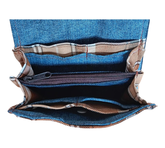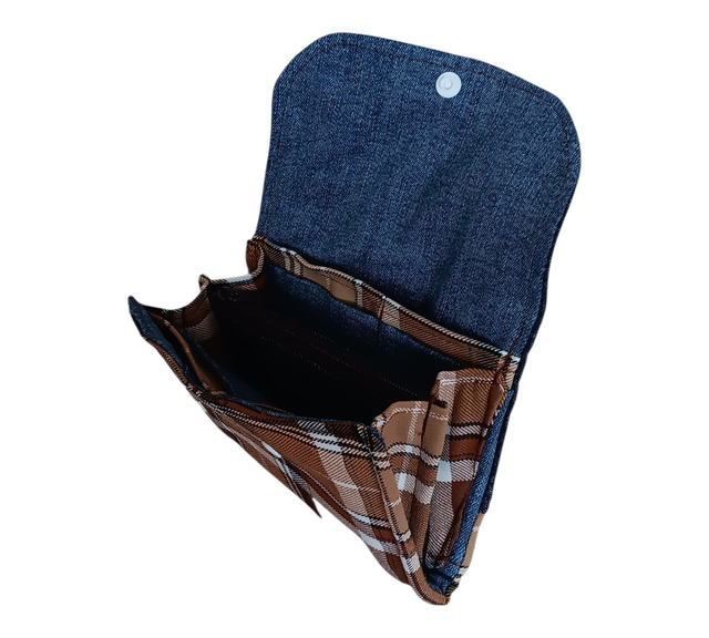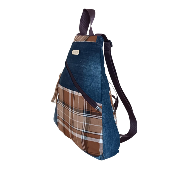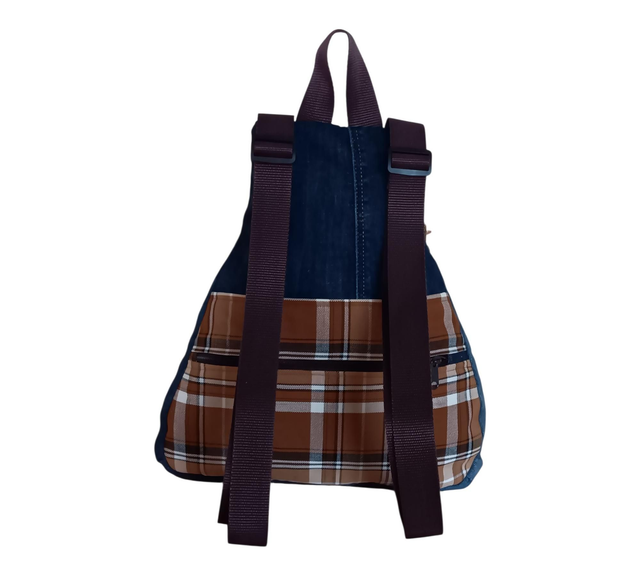 Practicidad, estilo y sostenibilidad en un solo conjunto. Este set está compuesto por una mochila mini y una cartera a juego, elaboradas con tela vaquera reciclada combinada con cuadros escoceses. Un diseño único que apuesta por la moda responsable sin renunciar a la comodidad.