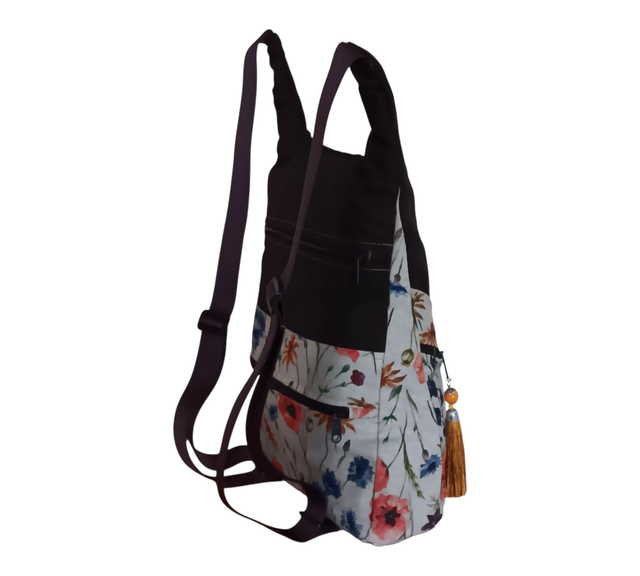 Elegancia natural y practicidad en un solo diseño. Esta mochila en tono marrón chocolate está adornada con delicadas flores silvestres, perfecta para quienes buscan un accesorio versátil y con estilo.