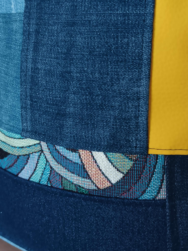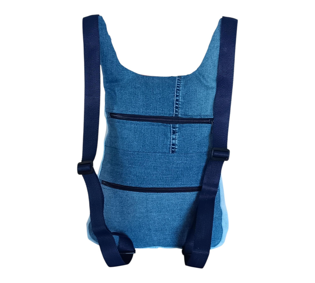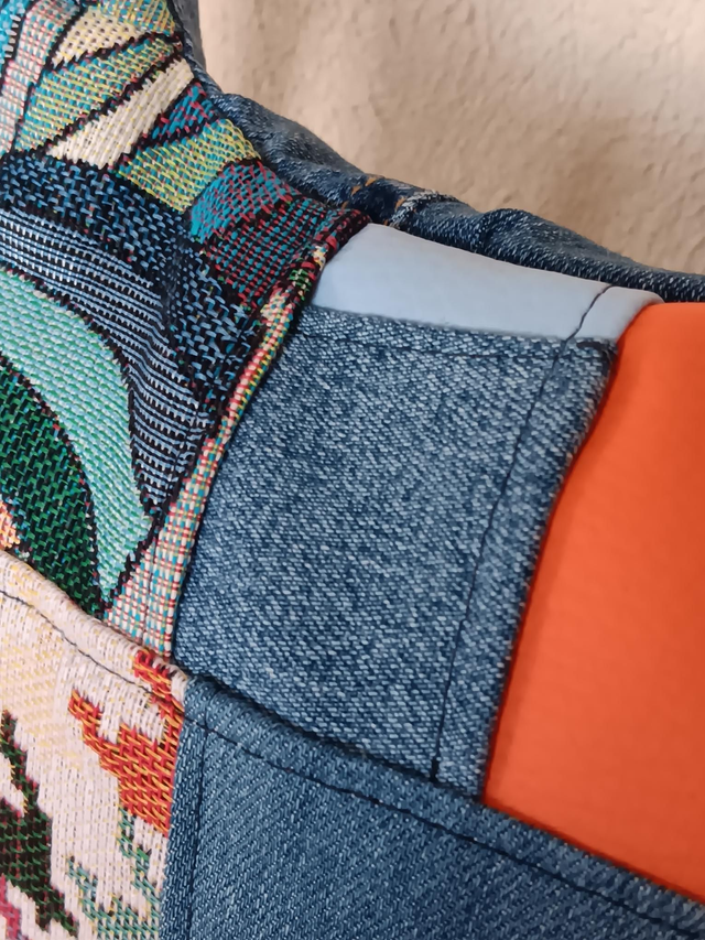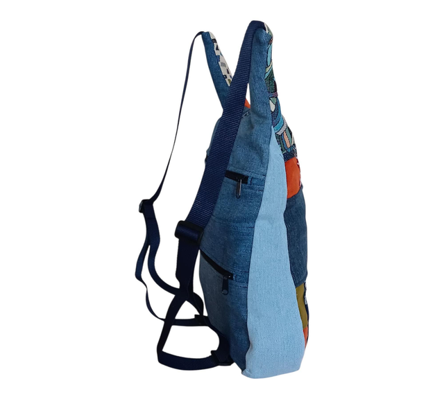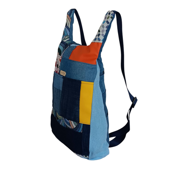 Una pieza única que combina sostenibilidad y estilo. Esta mochila está confeccionada a mano con telas recicladas: resistente vaquero, piel vegana de tacto suave y un delicado terciopelo que aporta un toque especial. Cada costura ha sido realizada con esmero, uniendo texturas distintas para crear un diseño exclusivo que no encontrarás en ninguna otra parte.