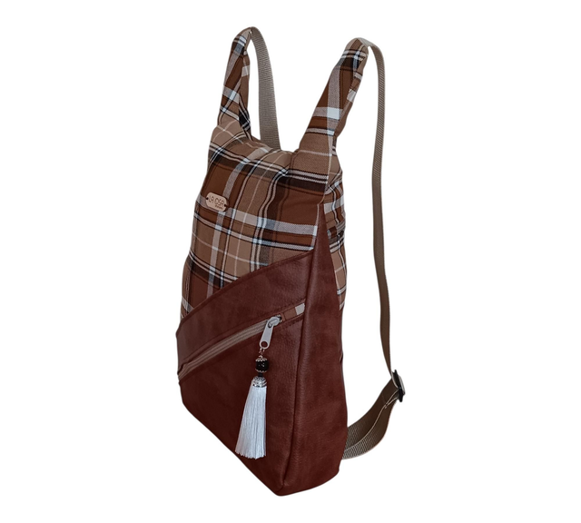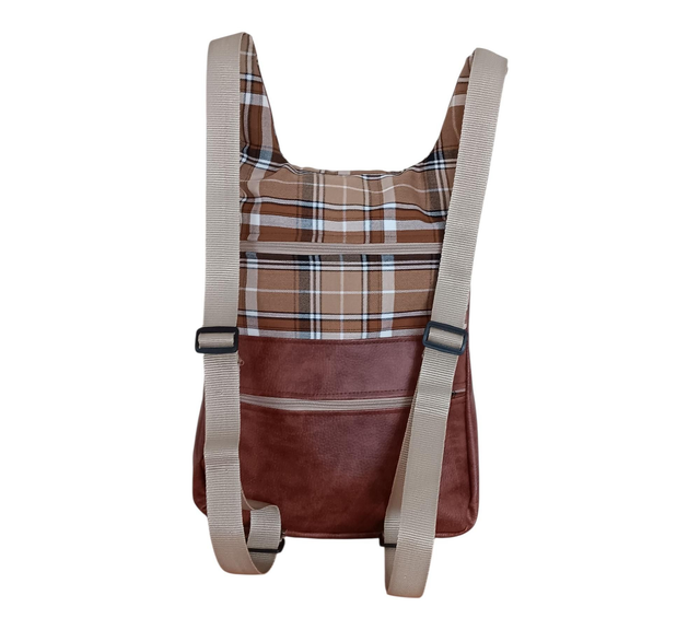 Esta mochila de tela con cuadros escoceses y piel vegana en tono marrón une el encanto del diseño tradicional con la practicidad moderna. Su acabado artesanal y sus detalles cuidados hacen de ella una pieza única, versátil y atemporal.
