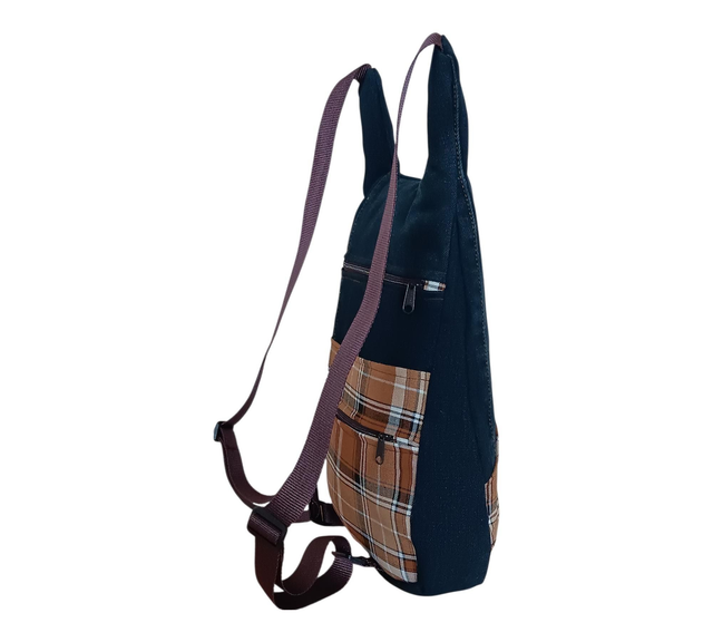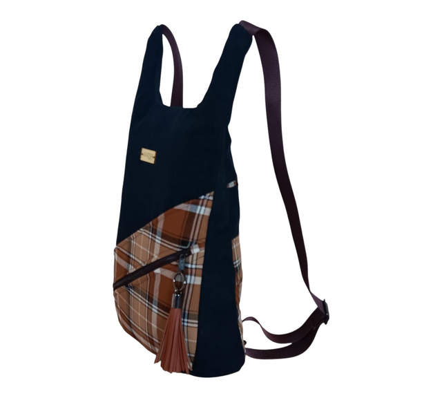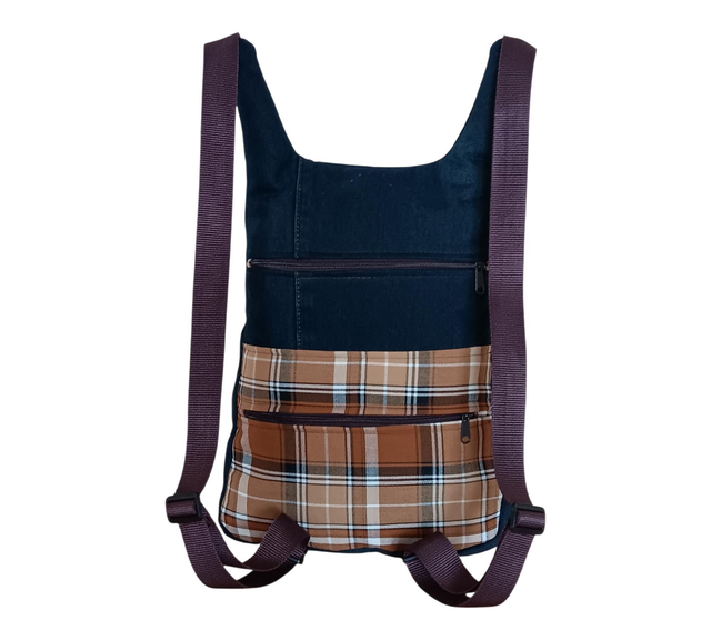 Esta mochila nace del encuentro entre la memoria y la artesanía: una pieza única creada con tela de vaquero reciclada y cuadros escoceses en tonos marrones, como un abrazo cálido de bosque en tarde dorada. Cada puntada guarda una segunda vida, un susurro de historias transformadas en belleza sostenible. 🌿✨