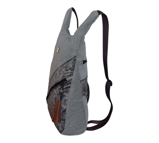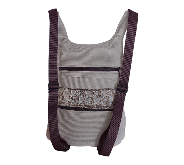 Esta mochila nace de la unión entre la pana reciclada, suave y resistente, y delicados detalles en tela damasco en tonalidades bronce y marrón, evocando la calidez de la tierra y el paso sereno del tiempo. Cada pieza es un pequeño homenaje a lo hecho con mimo y conciencia 🌿