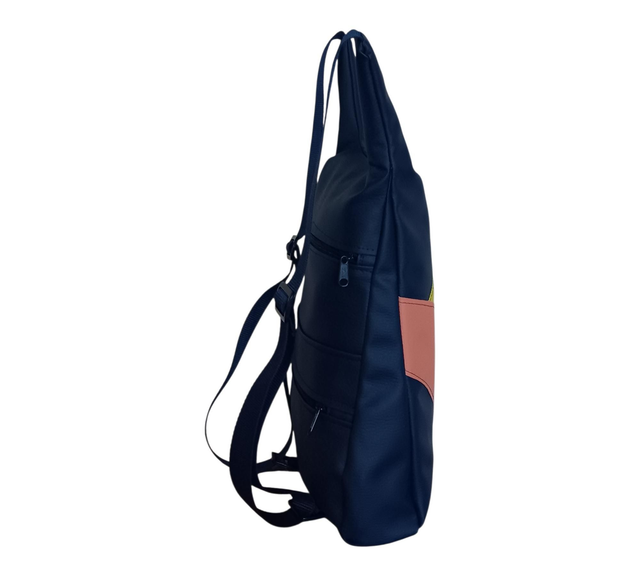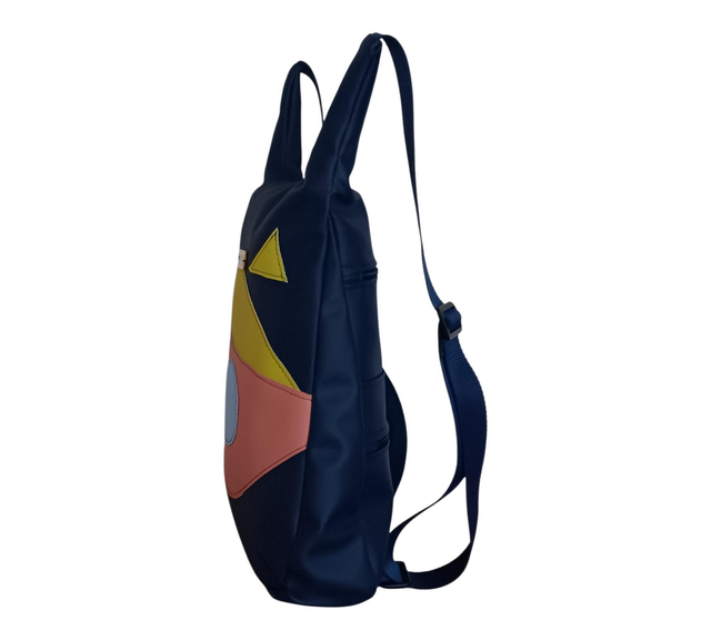 Esta mochila de piel vegana en azul marino es ese complemento que acompaña sin robar protagonismo, pero que siempre deja huella. Su dibujo original en piel vegana tricolor, cuidadosamente aplicado, le da un carácter único y artesanal que la convierte en una pieza especial.