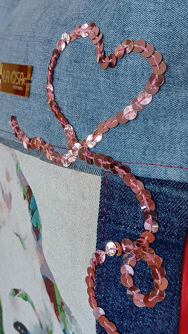 Un delicado camino de lentejuelas rosas serpentea como una cinta danzando al viento, formando un corazón que parece latir con cada movimiento 💕. Es una pieza que mezcla fuerza, feminidad y un punto rebelde, perfecta para quienes aman destacar sin perder elegancia.