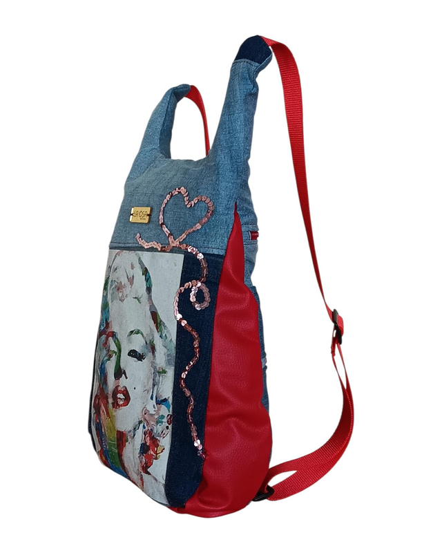Esta mochila está confeccionada en tela vaquera combinada con piel vegana roja, creando un contraste vibrante y lleno de personalidad. En el panel frontal, la icónica imagen de Marilyn Monroe ilumina el diseño con su magnetismo inolvidable.