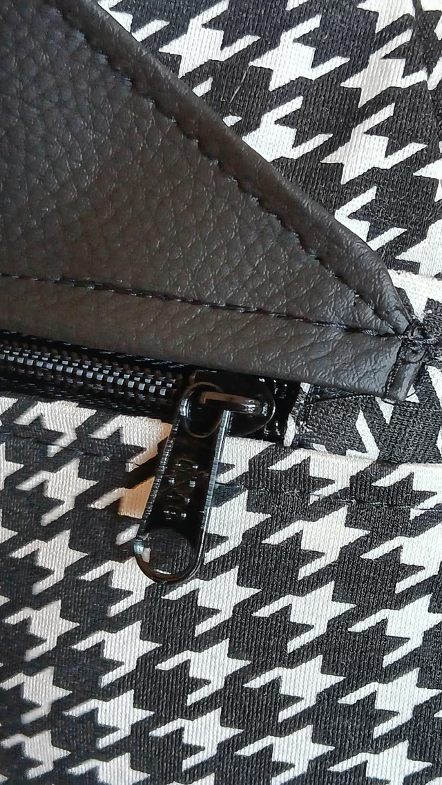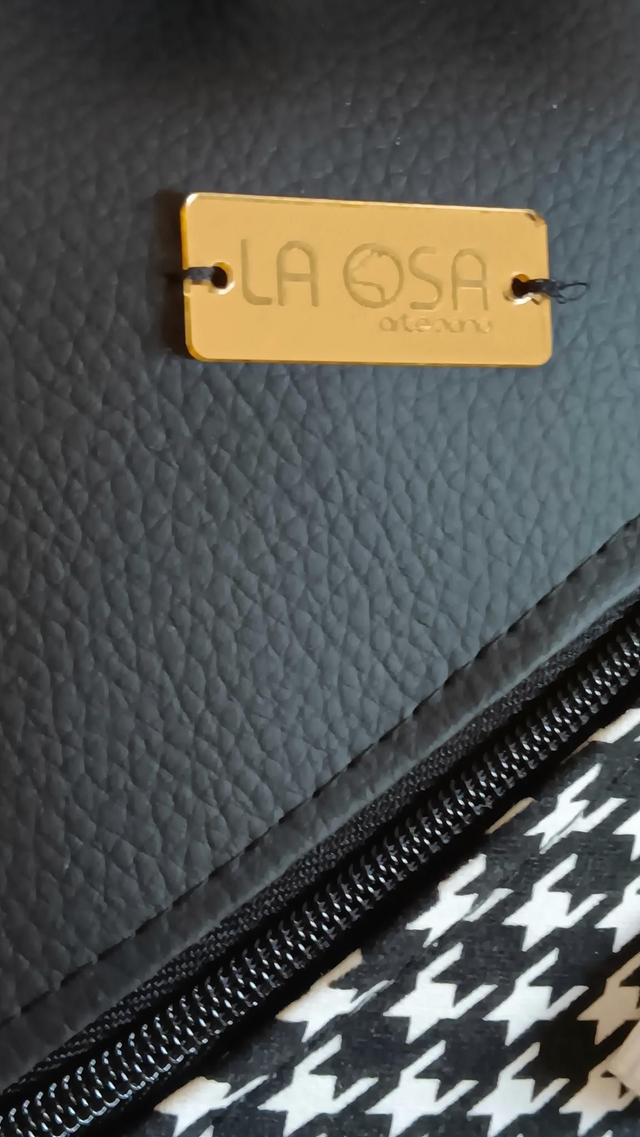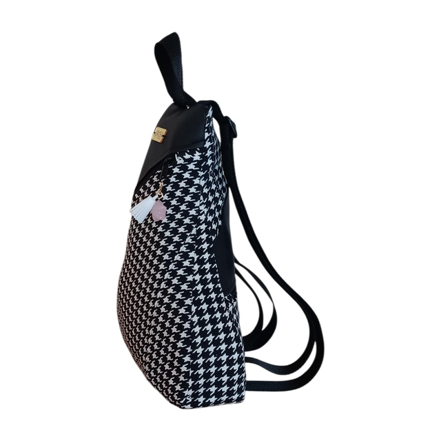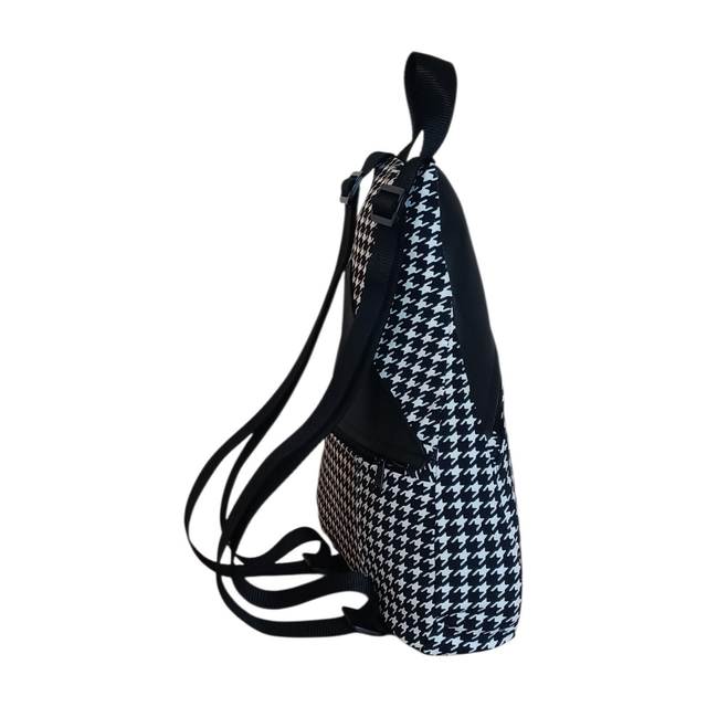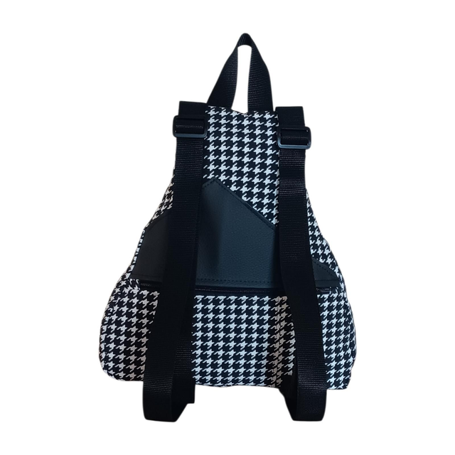 Esta mochila modelo Eva nace del rescate de una falda con estampado pata de gallo en blanco y negro, transformada cuidadosamente en una pieza con carácter y elegancia. El tejido se combina con piel vegana negra, creando un contraste sobrio y atemporal.