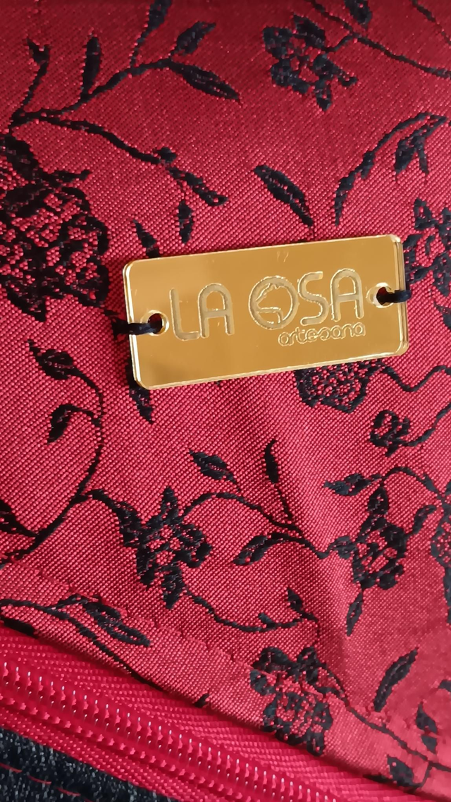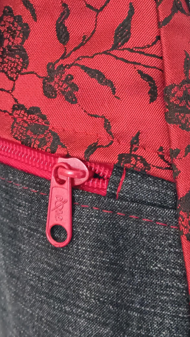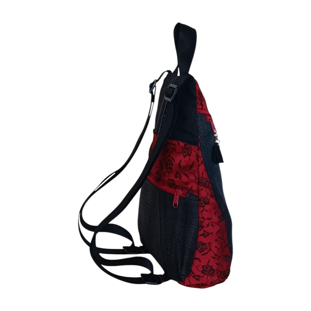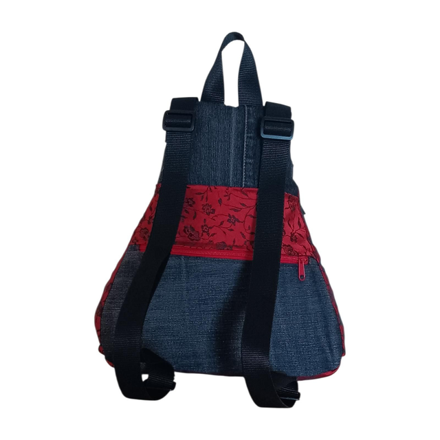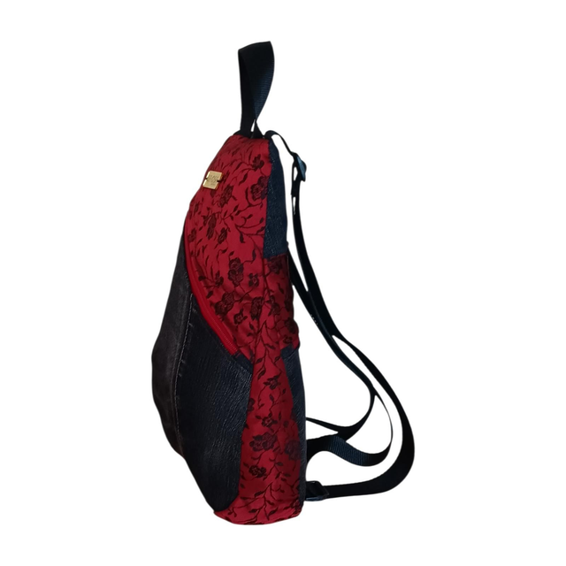 Esta mochila Eva está confeccionada con denim negro desgastado, combinado con una tela en rojo sangre adornada con delicadas rosas bordadas en negro, creando una mezcla poderosa y elegante.