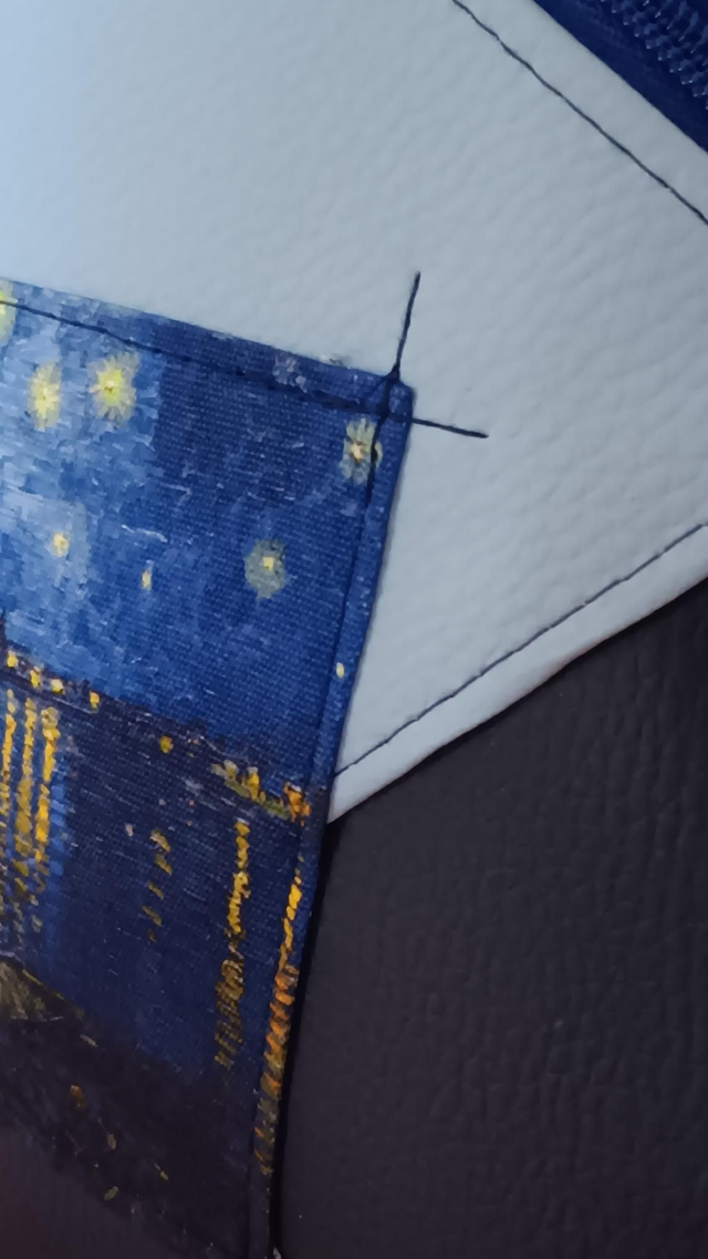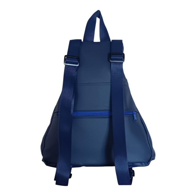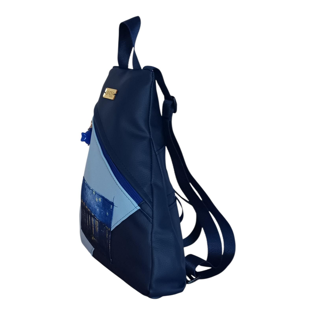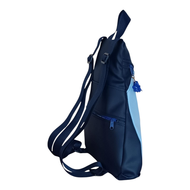 Esta mochila modelo Eva está creada a mano combinando piel vegana azul marino y celeste, una mezcla que recuerda al cielo profundo iluminado por reflejos de luz.