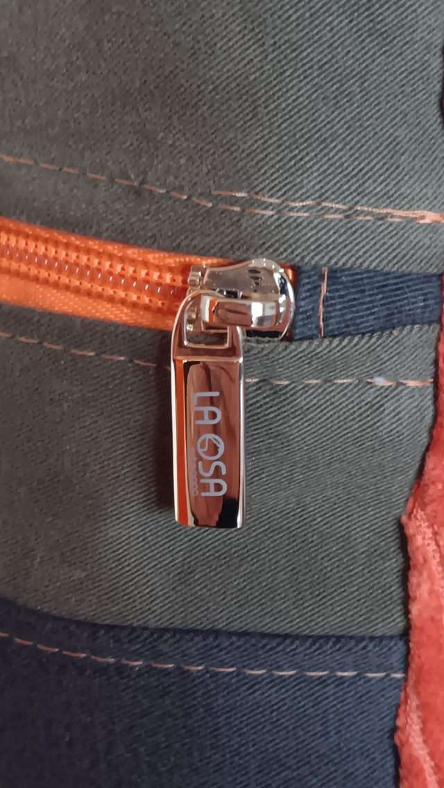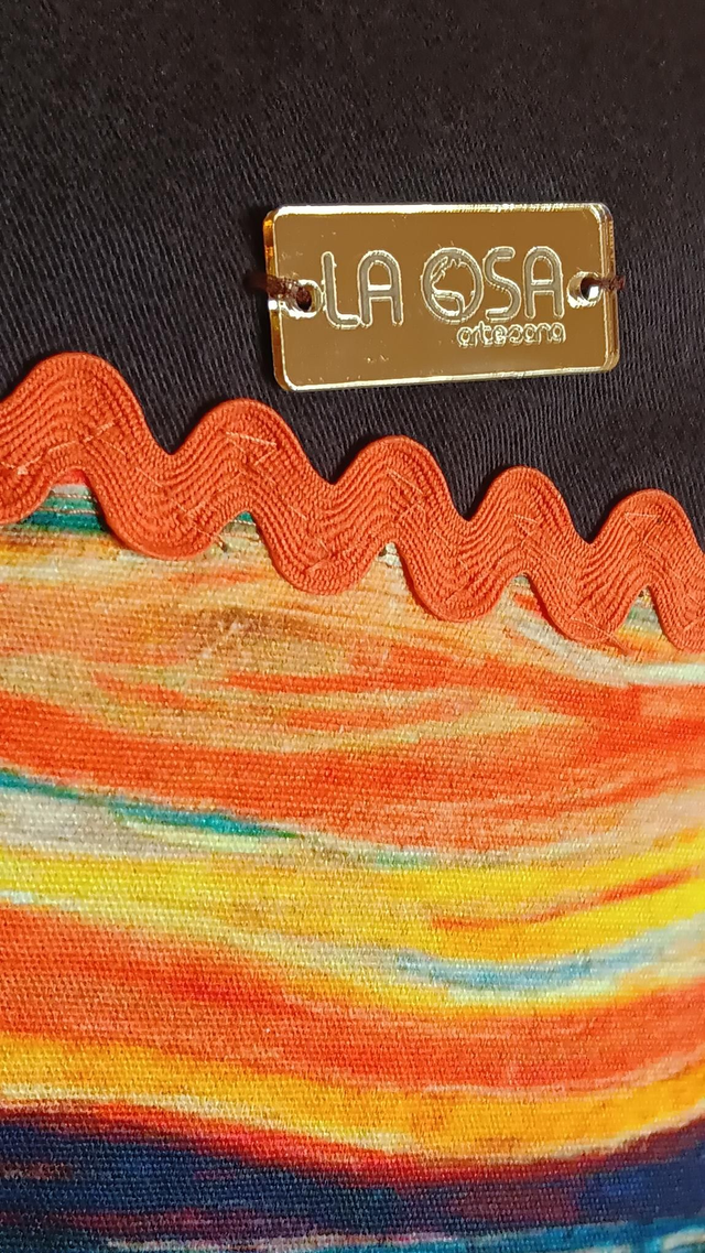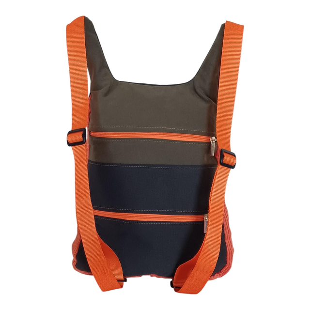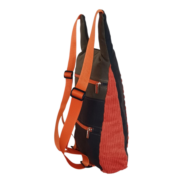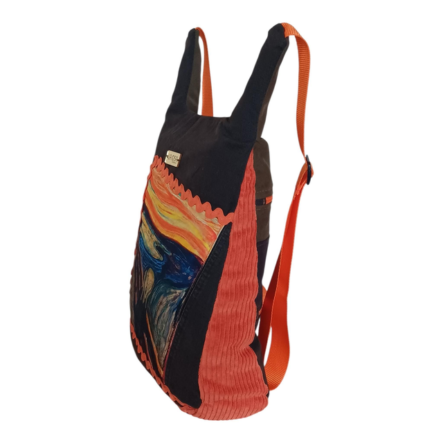 Las cremalleras en color naranja vibrante, al igual que las cintas y los laterales de la mochila en pana reciclada. Una combinación audaz que conecta el arte del panel con el diseño completo de la pieza, creando armonía, contraste y personalidad.