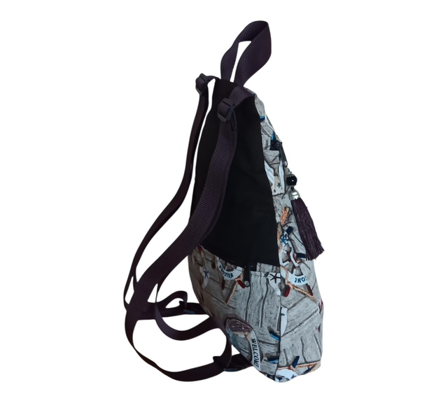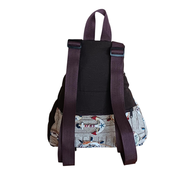 ompacta, práctica y con un diseño que evoca frescura y aventura. Esta mochila mini está confeccionada en tela marrón chocolate combinada con motivos marineros, creando un contraste elegante y original para acompañarte en tu día a día.
