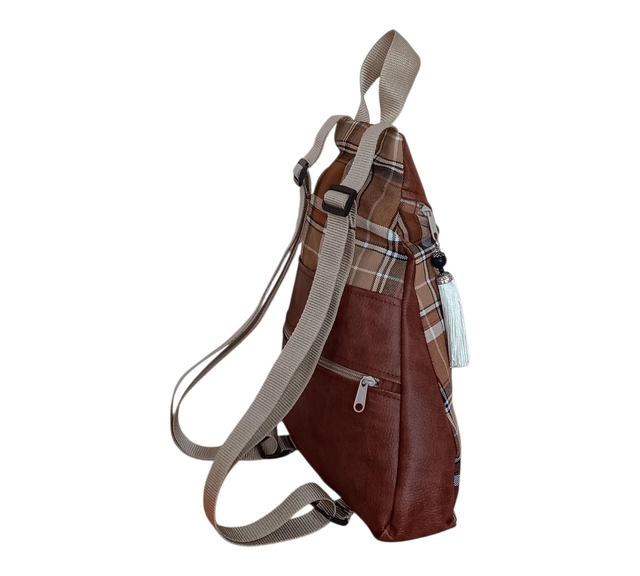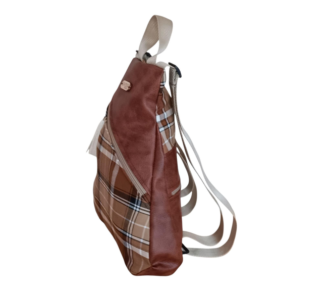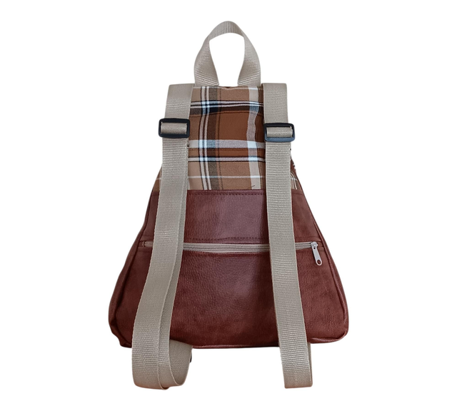 Esta mochila mini de tela con cuadros escoceses y piel vegana marrón combina el encanto clásico con practicidad en tamaño compacto. Perfecta para quienes buscan estilo, funcionalidad y un toque artesanal en cada detalle.