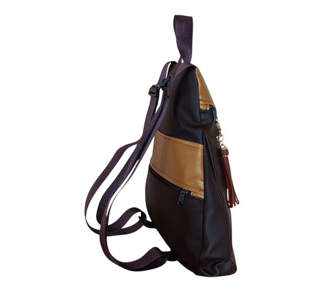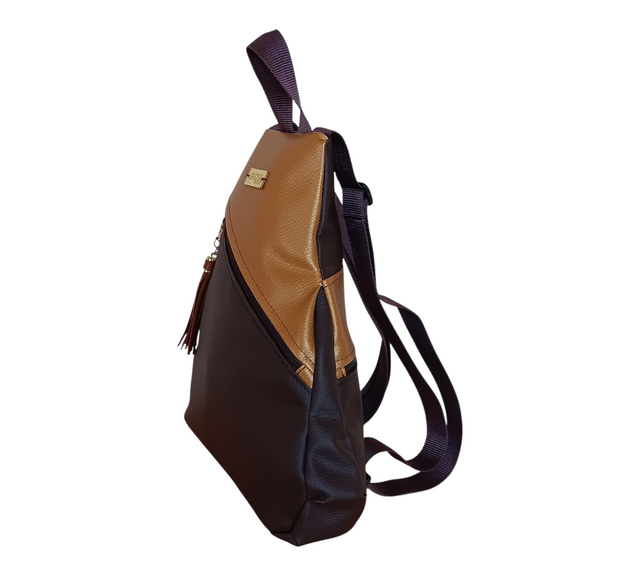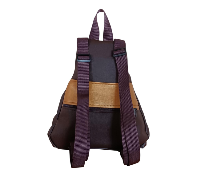Esta Mochila Mini de piel vegana en tono marrón chocolate lleva un bolsillo exterior posterior para lo imprescindible, y un bolsillo interior donde tus tesoros quedan a salvo.