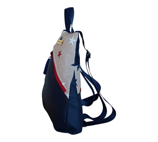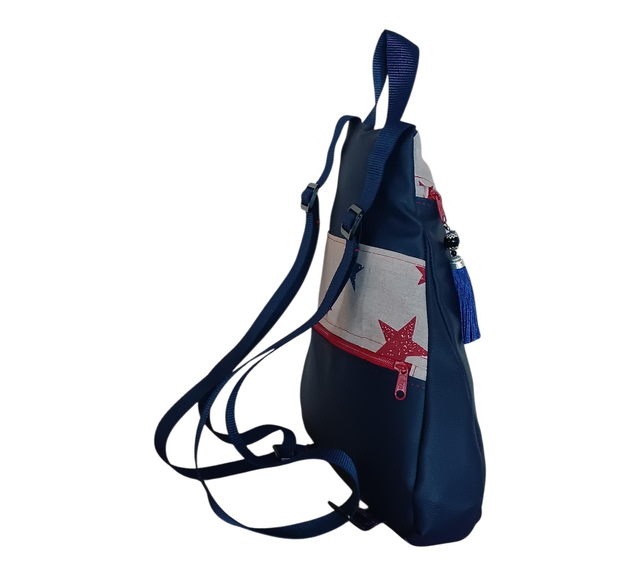 Esta mochila mini de piel vegana en azul marino se llena de magia con detalles de tela estampada de estrellas, creando un contraste delicado y soñador que invita a mirar hacia arriba 💙⭐.
