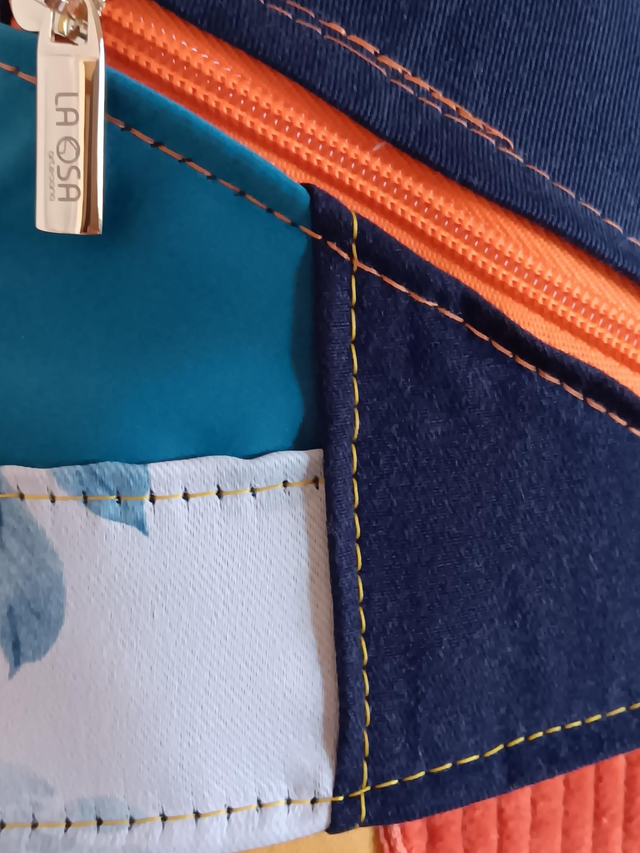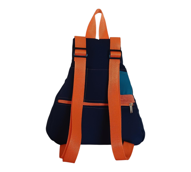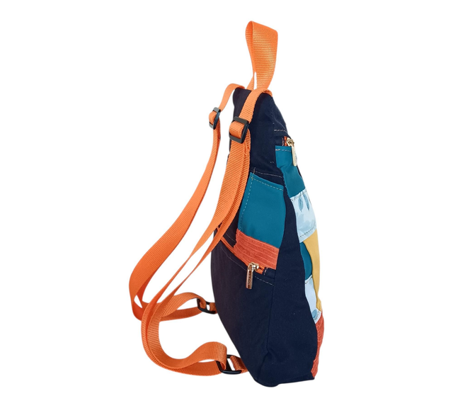 Sobre una base de azul marino profundo, esta mini mochila cobra vida gracias a una combinación de retales reciclados, unidos uno a uno, formando un patchwork lleno de matices y carácter 🌙🎨