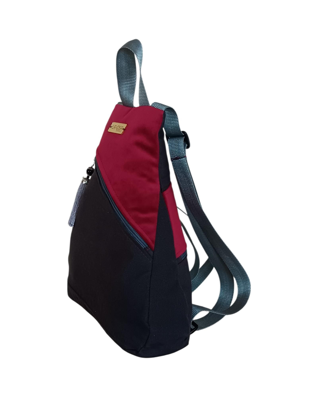 Esta mochila mini está confeccionada a partir de telas recicladas, dando una segunda vida a materiales llenos de historia. El gris oscuro se encuentra con delicados detalles en terciopelo color borgoña, creando un contraste elegante y envolvente.