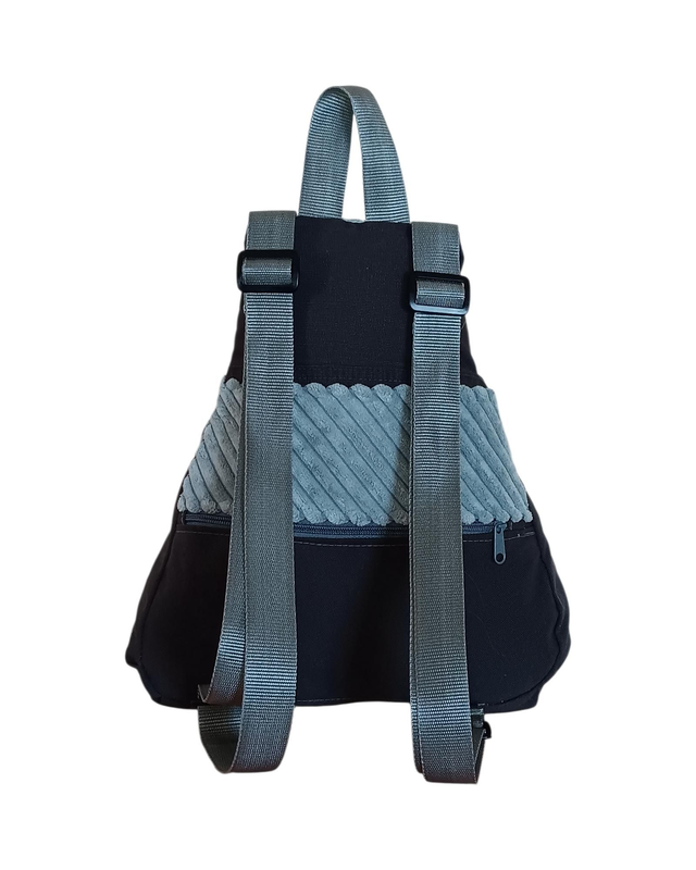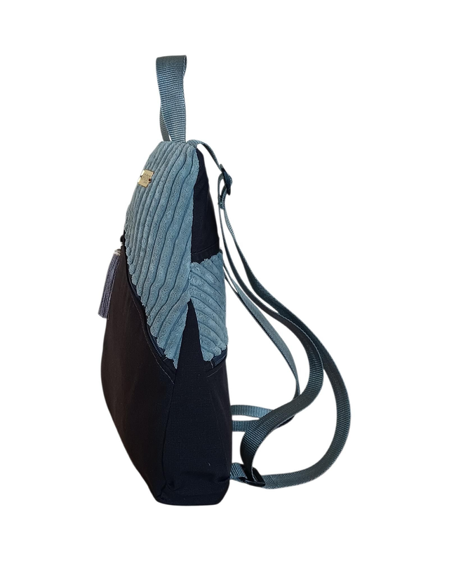 Esta mochila mini nace del respeto por los materiales y del amor por lo bien hecho. Realizada con telas recicladas, combina un gris oscuro atemporal con detalles en pana aterciopelada, aportando calidez y carácter a cada puntada.