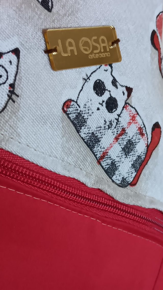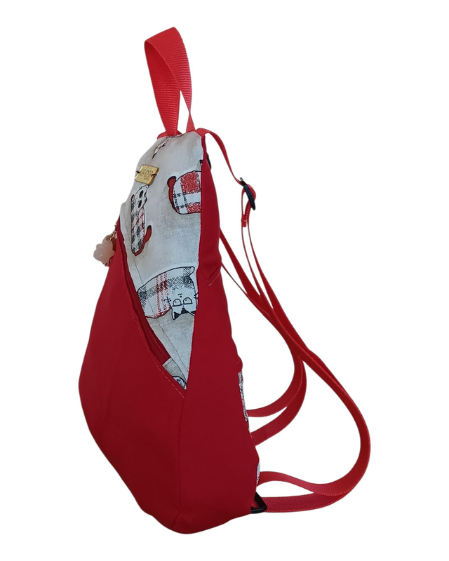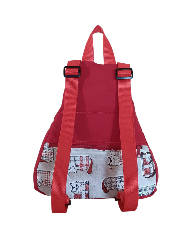 Esta mochila mini roja combina la fuerza del color con un estampado de gatitos simpáticos que roba sonrisas allá donde va. Confeccionada a partir de telas recicladas, es ligera, práctica y llena de encanto.
