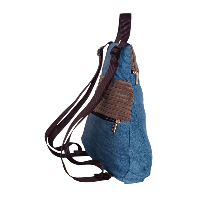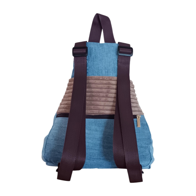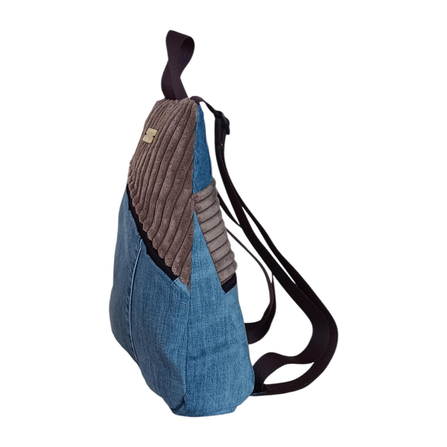 Esta mochila mini en tejido vaquero se realza con delicados detalles en pana aterciopelada, aportando textura y un aire cálido que enamora a primera vista.
