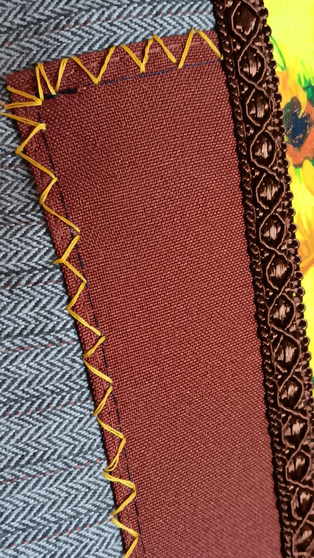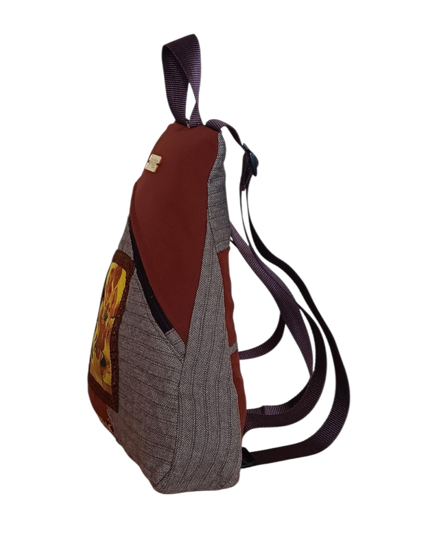El corazón de esta mochila es un panel de la pintura “Los Girasoles” de Van Gogh, enmarcado cuidadosamente con una tira bordada, como si se tratara de un pequeño lienzo. Bajo él, un recuadro marrón cosido a mano se adorna con bordado amarillo, evocando la luz y el movimiento de los girasoles al sol 🌻✨