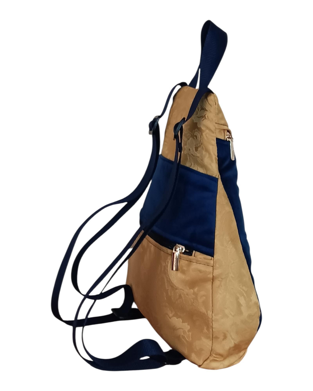 Esta mochila nace del abrazo entre el terciopelo azul profundo y el damasco amarillo, una combinación pensada para evocar la suavidad del cielo nocturno y el destello vibrante de las estrellas ✨