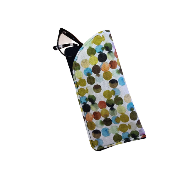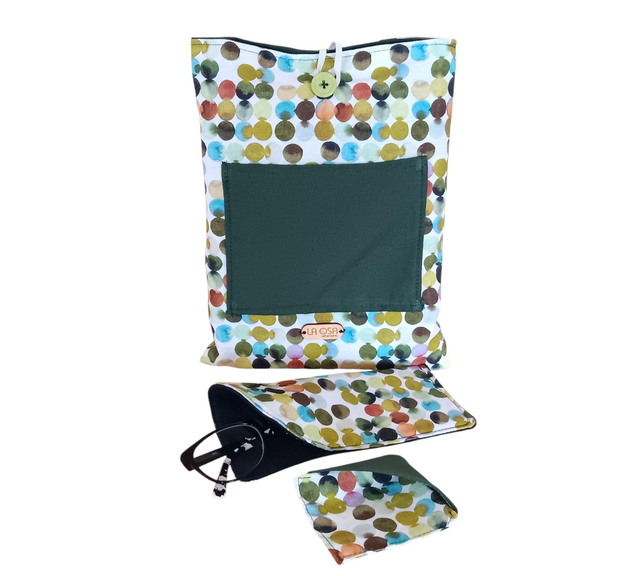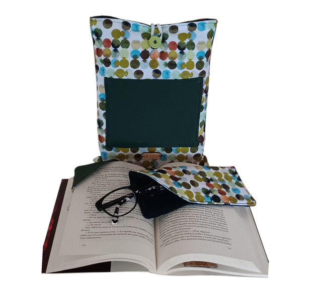 El conjunto incluye también una funda para gafas y un marcapáginas elaborados con las mismas telas, creando una armonía alegre y cuidada hasta el último detalle.