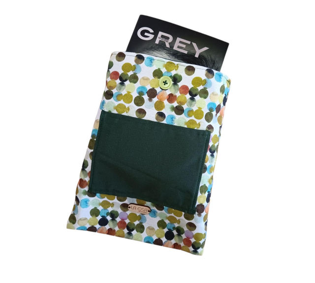 La funda para libro, confeccionada a mano con una encantadora tela de lunares de colores combinada con un fresco verde, protege tus libros mientras aporta un toque de estilo único. Su bolsillo exterior te permite guardar notas, un bolígrafo o tu marcapáginas favorito, siempre a mano.