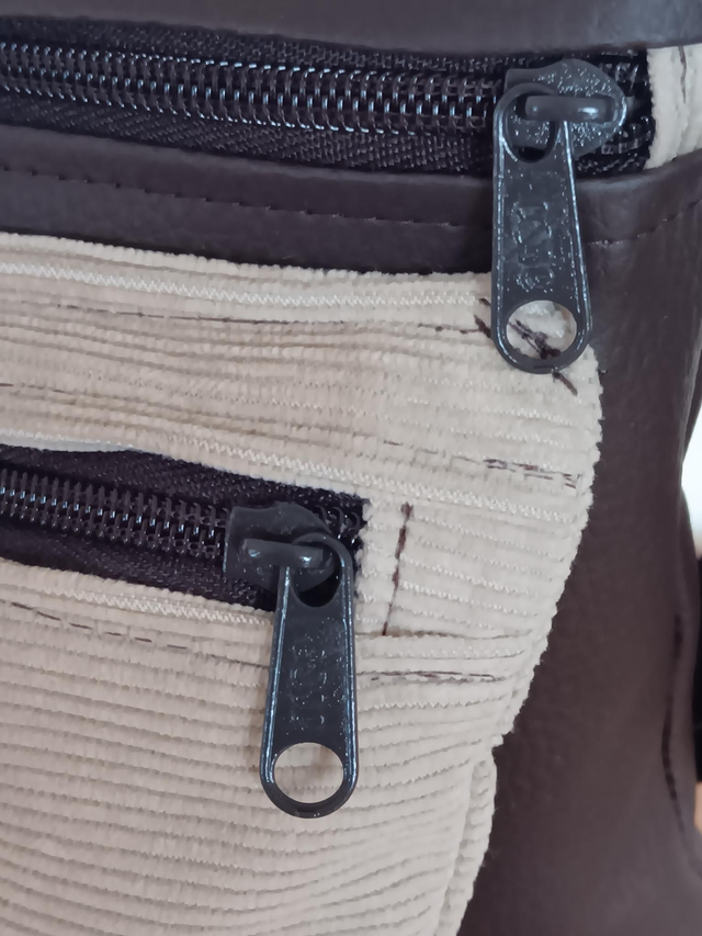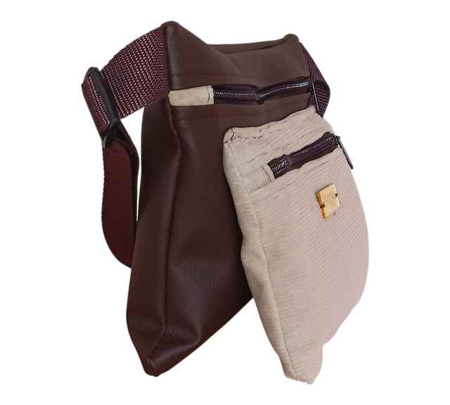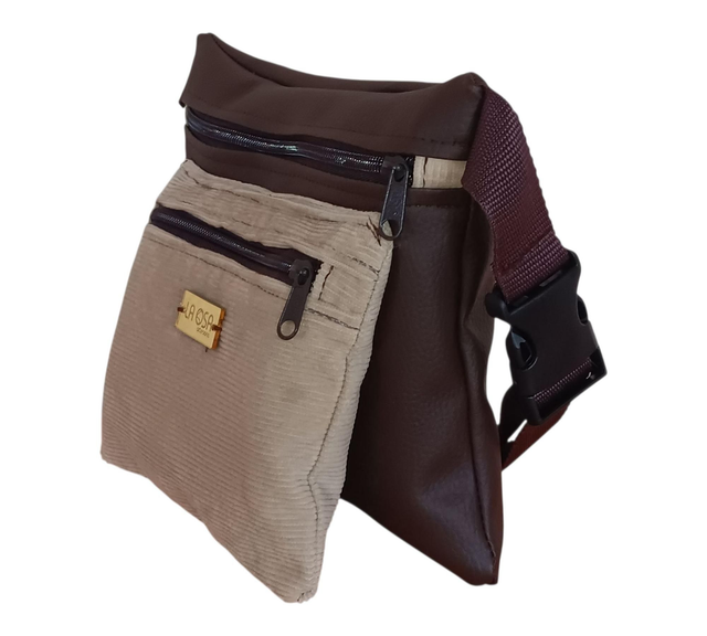 Hecha a mano con pana reciclada y piel vegana, esta riñonera une la calidez de los materiales sostenibles con la practicidad del diseño artesanal.
