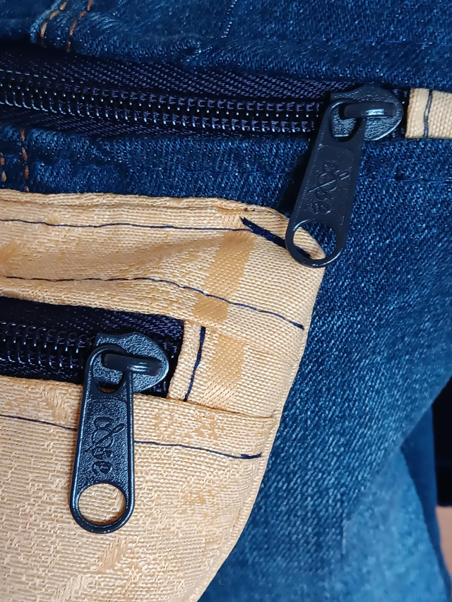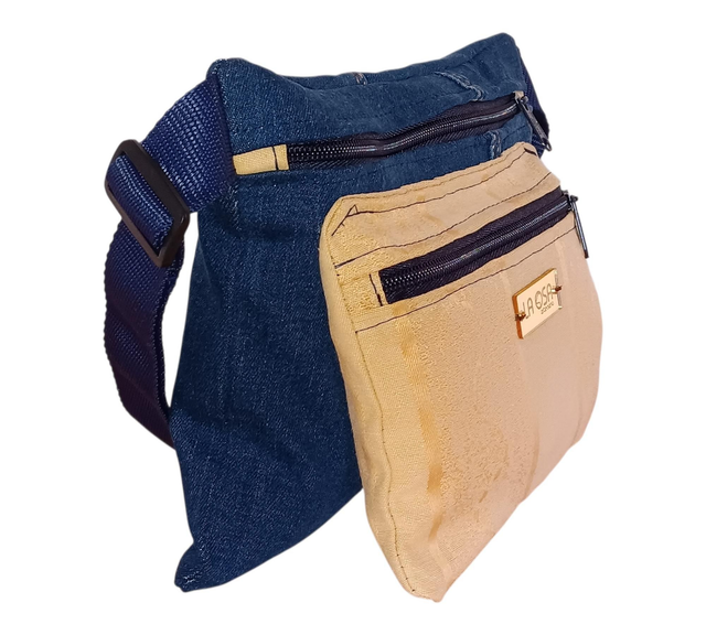Nacida de la magia entre lo rústico y lo luminoso, esta riñonera combina tela vaquera reciclada con una delicada tela en color oro viejo, creando un contraste cálido que recuerda al brillo suave del sol al atardecer. 🌅💛