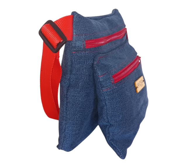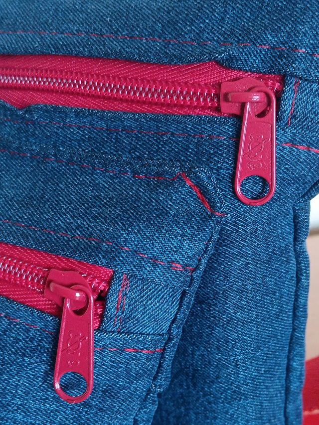 Sus dos compartimentos te ayudan a llevarlo todo en orden, mientras las cremalleras rojas aportan un toque de carácter, como un pequeño latido rebelde que destaca sobre el azul del denim.