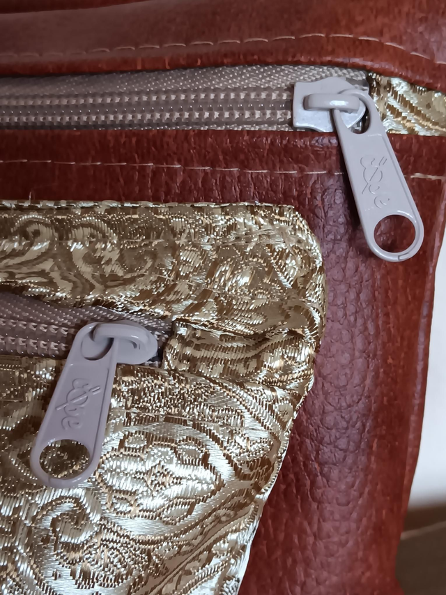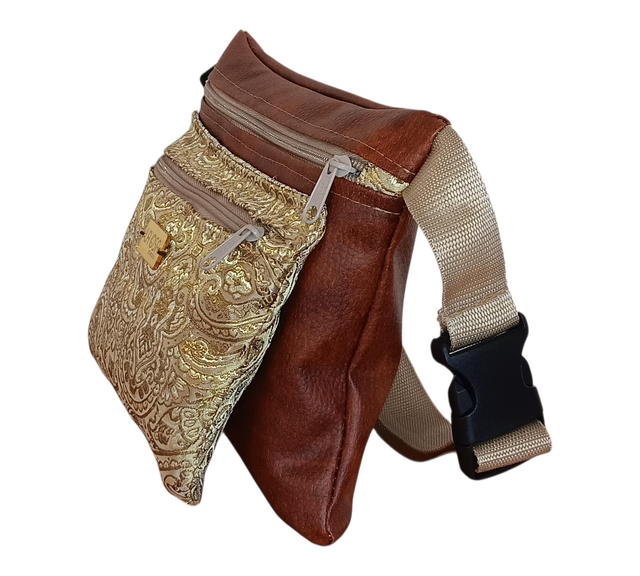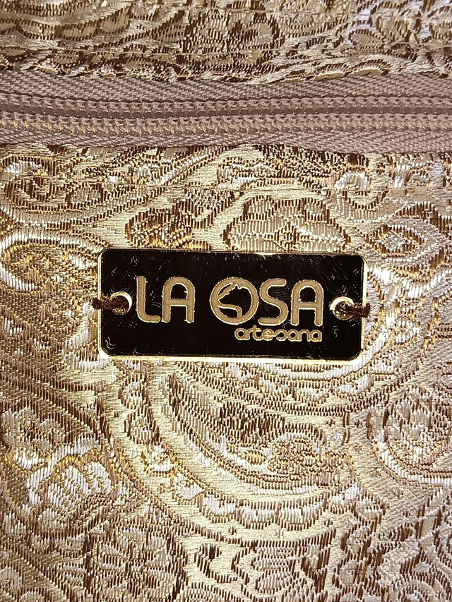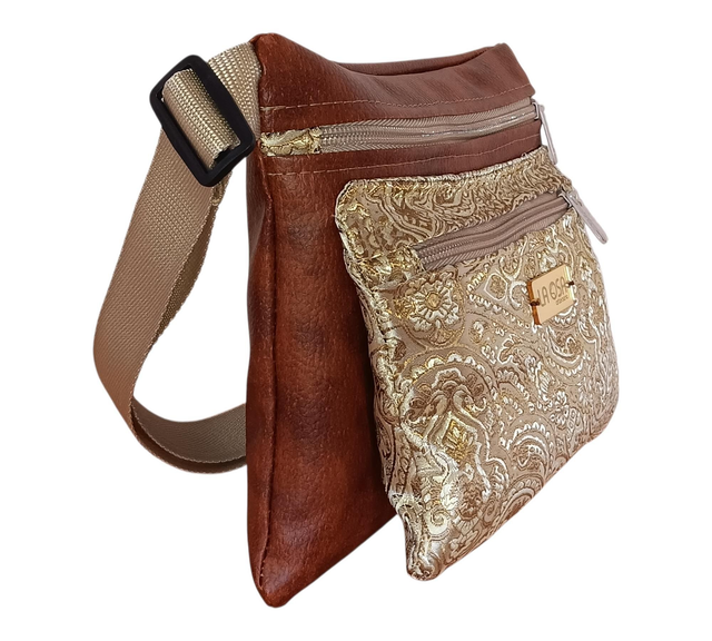 Confeccionada en piel vegana y damasco dorado suave, comparte telas y esencia con la mochila y la mochila mini del mismo conjunto, creando una armonía perfecta para quienes aman combinar.