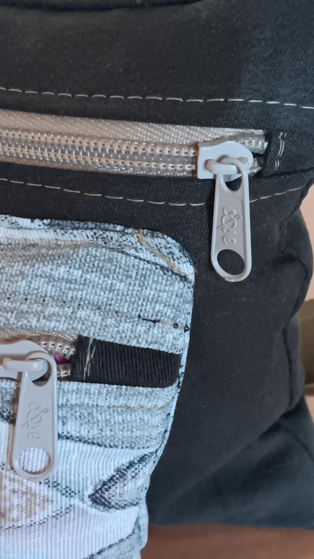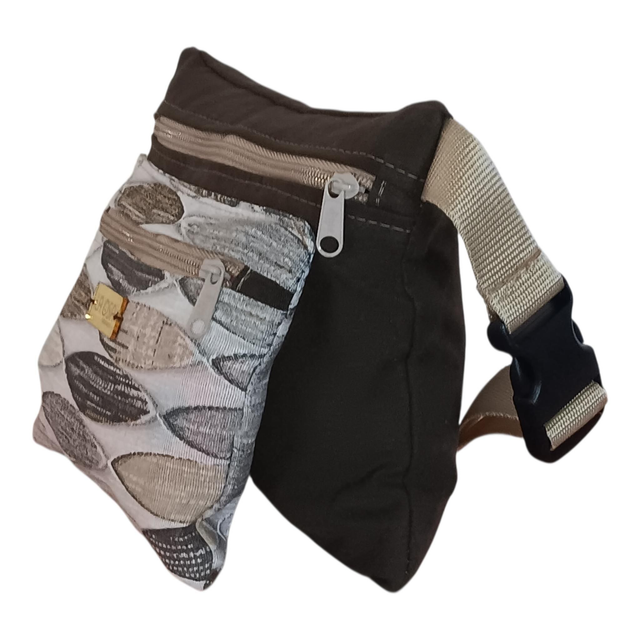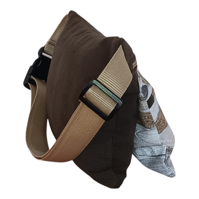 Confeccionada a mano a partir de telas recicladas, combina en su bolsillo delantero una armonía suave de tonos marrones, beiges y grises que evocan caminos de tierra, piedra y arena. El compartimento posterior, en un elegante tono caqui oscuro, aporta profundidad y carácter.